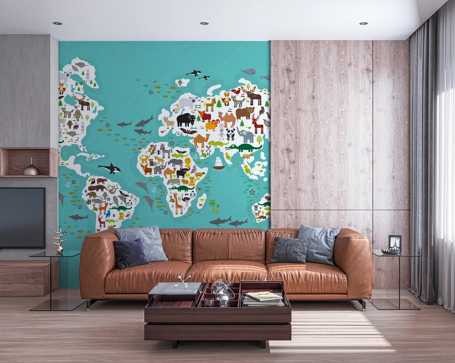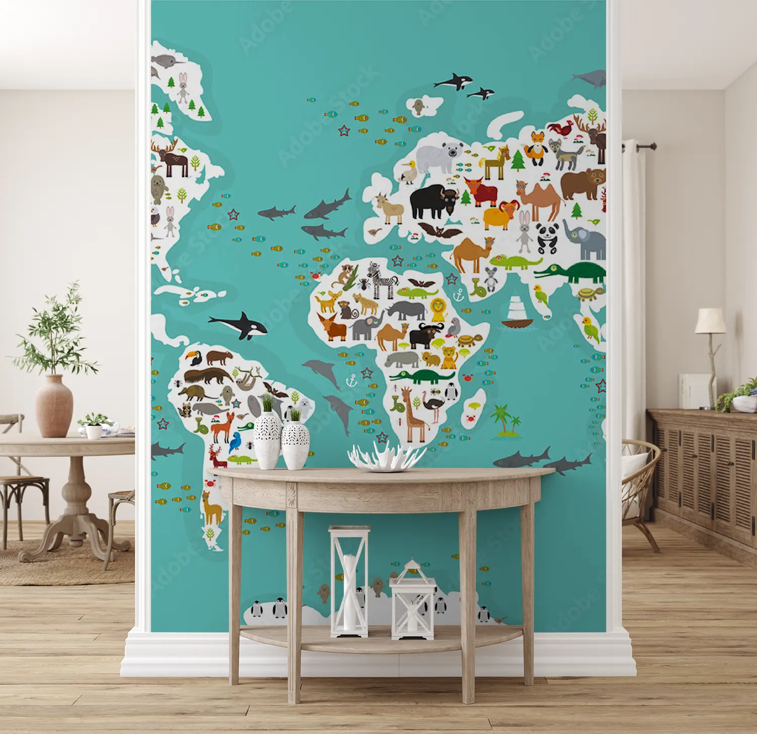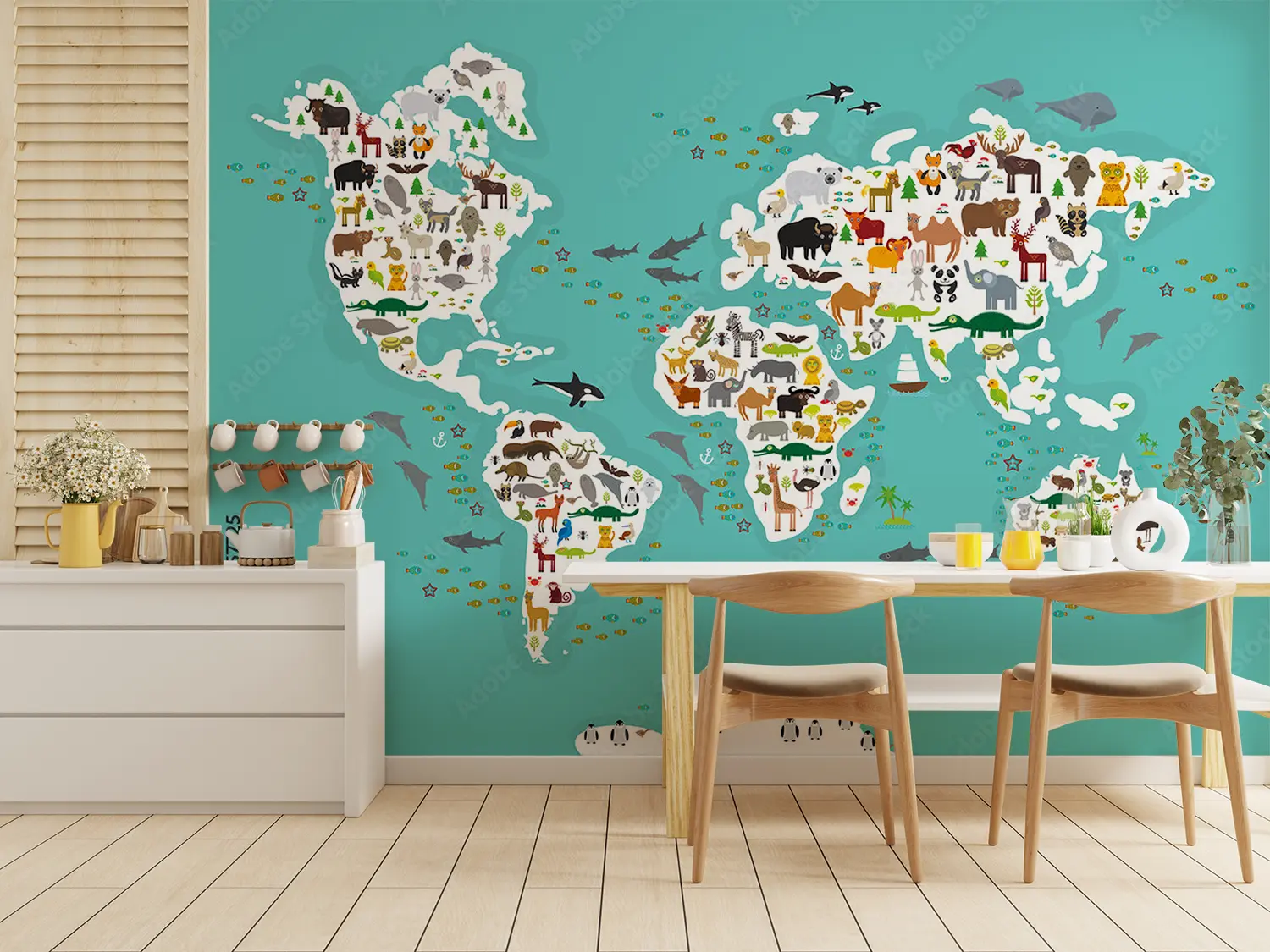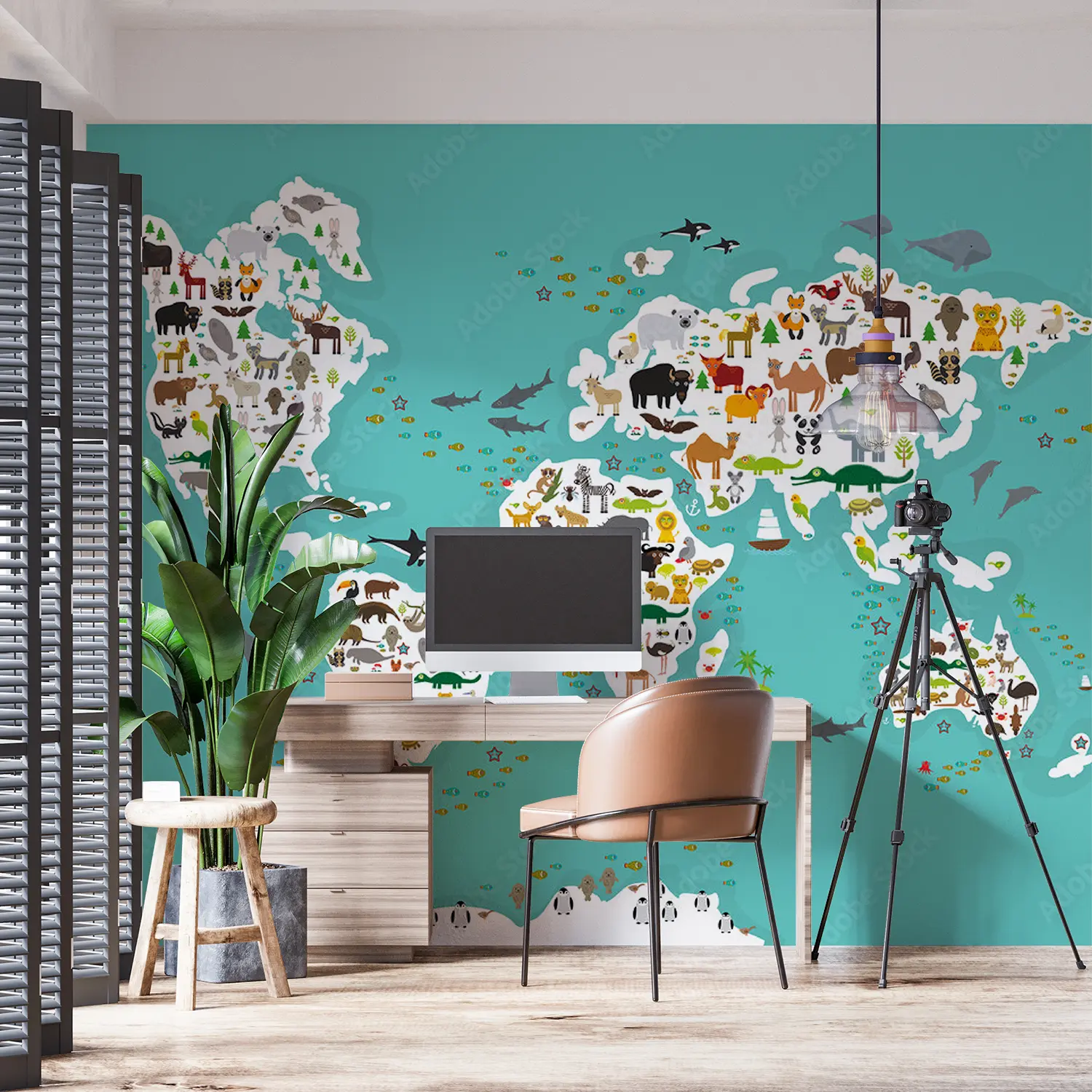 Transform your space with this stunning world map adorned with a variety of animals and birds, creating a whimsical and captivating aesthetic. Ideal for adding a touch of nature to your home decor, this vibrant illustration features soothing shades of green, brown, and white, complemented by accents of gold. Elevate your space with this unique and eye-catching piece.