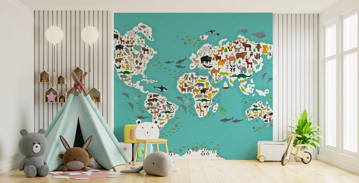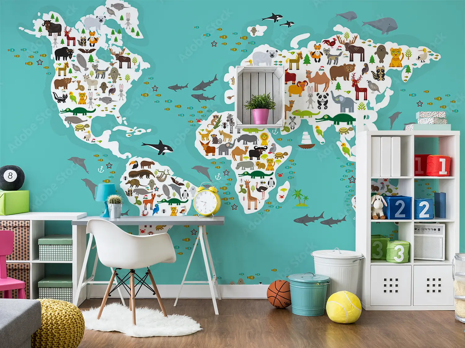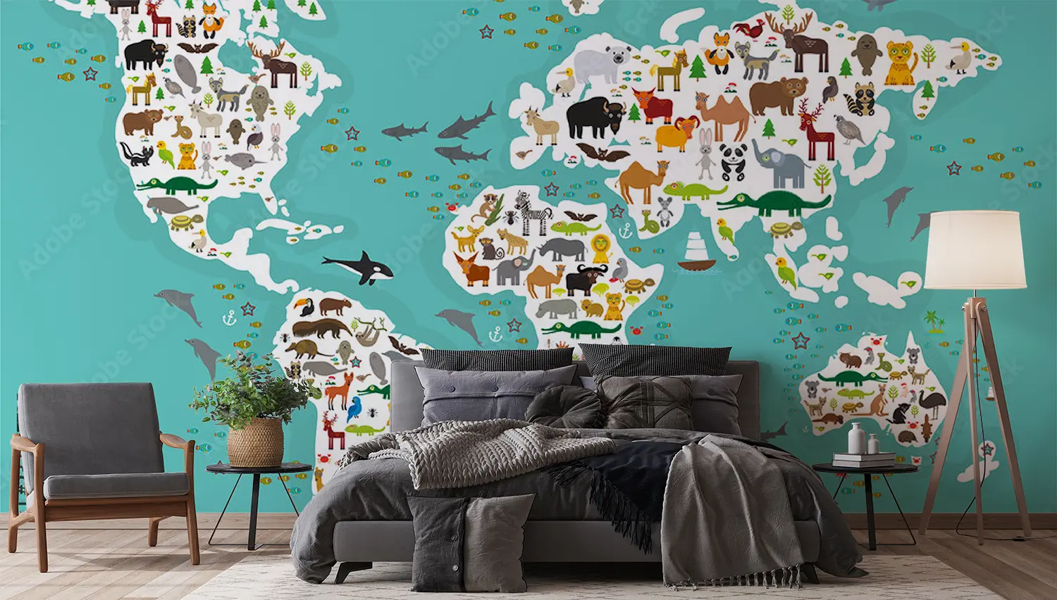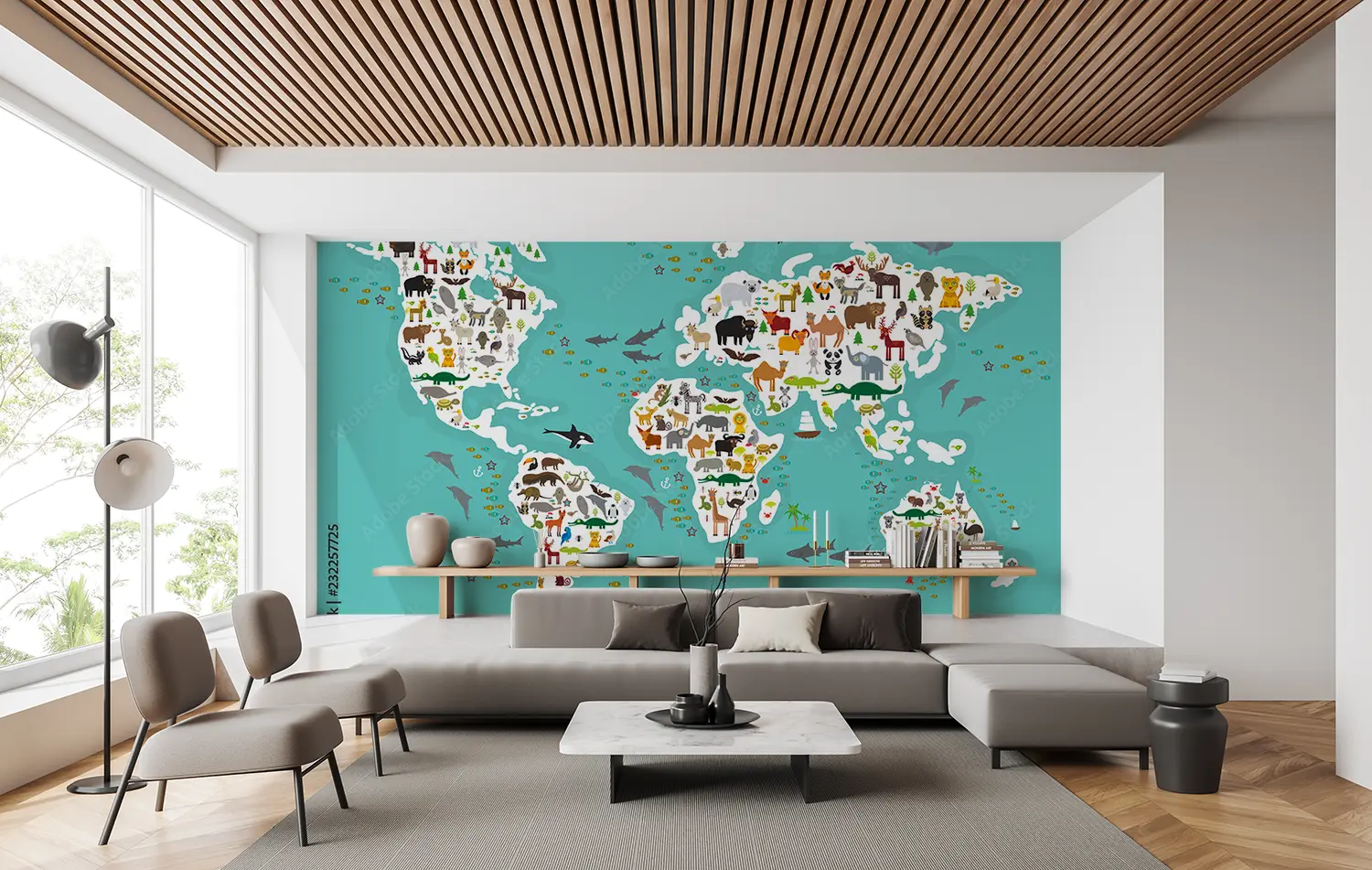Transform your space with this stunning world map adorned with a variety of animals and birds, creating a whimsical and captivating aesthetic. Ideal for adding a touch of nature to your home decor, this vibrant illustration features soothing shades of green, brown, and white, complemented by accents of gold. Elevate your space with this unique and eye-catching piece.